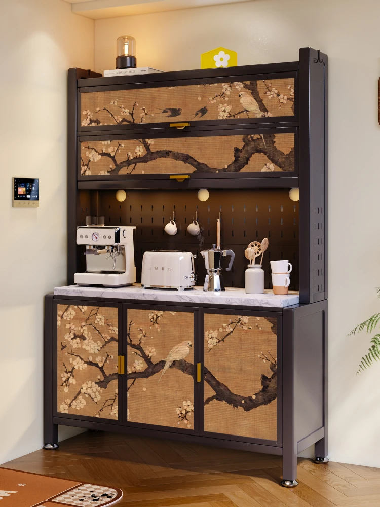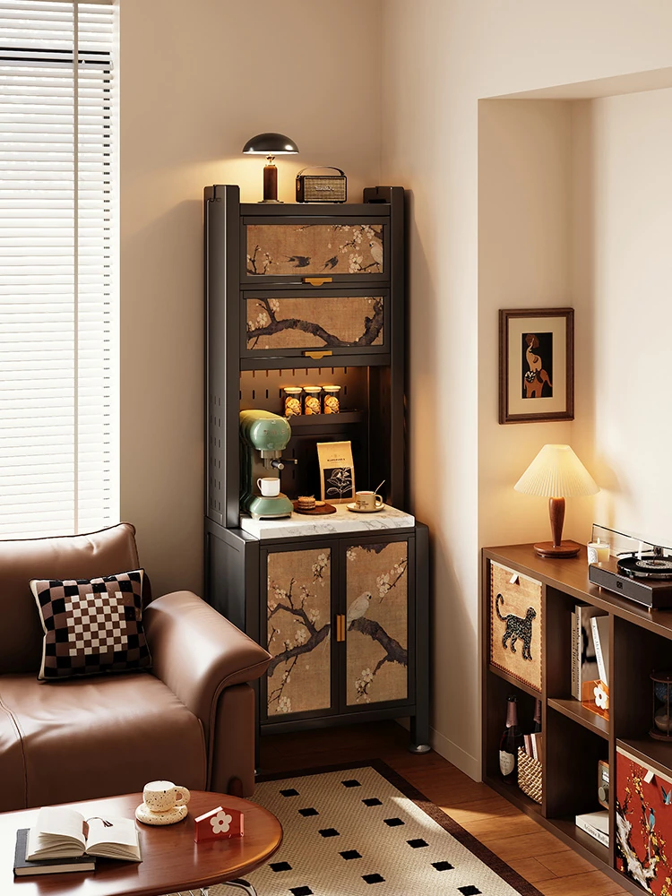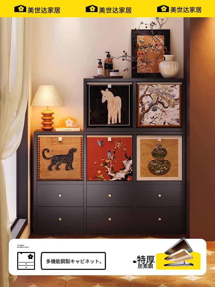 美世达の中華風カーボンスチール製の壁付け食器棚 - 鋼鉄と皮革のスタイリッシュな収納キャビネット、リビングルームにぴったり!デザイン性と実用性を兼ね備えた一体型収納で、おしゃれな空間を演出します。
