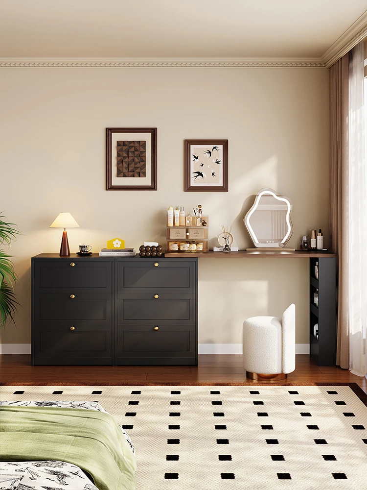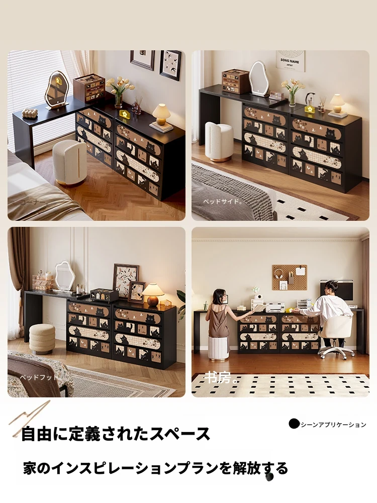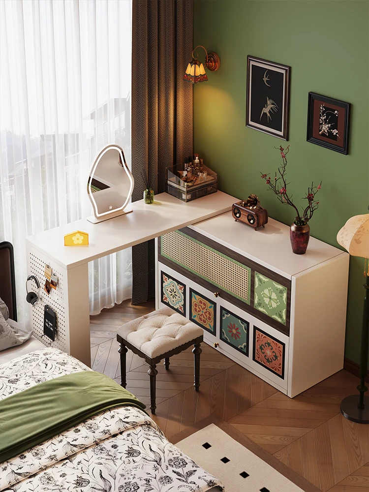 美世达伸縮式化粧台と収納チェスト一体型、スタイリッシュな寝室用化粧デスク。中古のクリーム色ベッドフットボードとマッチし、優雅な空間を演出します。整理整頓も簡単で、毎日のメイク時間を特別に!