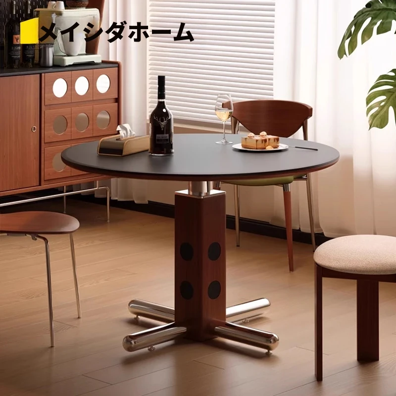 美世达のヴィンテージスタイルの岩板ラウンドテーブル - 天然木製のベースとレトロなアルミ合金脚を兼ね備えた、小型家庭向けダイニングテーブル。おしゃれでコンパクトなデザインで、どんなインテリアにもマッチします!