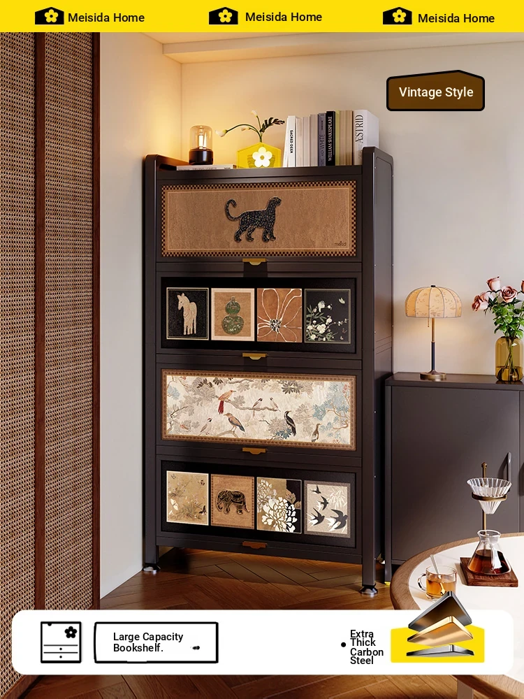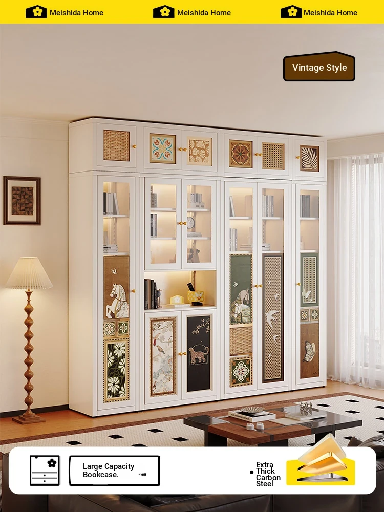 Mestada Vintage Steel Bookshelf - Elegant Floor Storage Rack, Dustproof Iron Bookcase for Living Room, Wall-Mounted Design for Space-Saving Storage