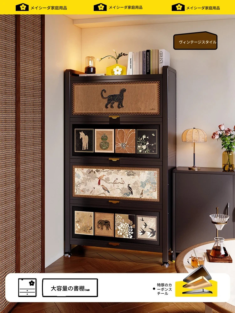 美世达アンティーク風スチール製フロアブックシェルフ - おしゃれなアイアンブックキャビネット、ほこりから守る収納力抜群の壁付けスタイル!リビングに最適な収納ソリューションです。