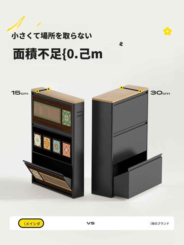美世达のスリム玄関シューズキャビネット - 中古風デザインで超薄型、狭い入り口にもピッタリ!スタイリッシュな鋼製収納で、壁に寄せてスペースを有効活用。あなたの玄関をおしゃれに演出します!