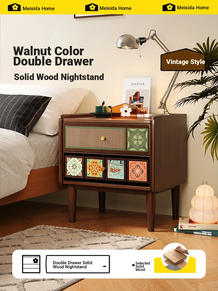 Mersida Walnut Color Solid Wood Nightstand - 2025 New Vintage-Style Bedroom Side Cabinet for Home Storage - Chic Retro Accent for Your Space