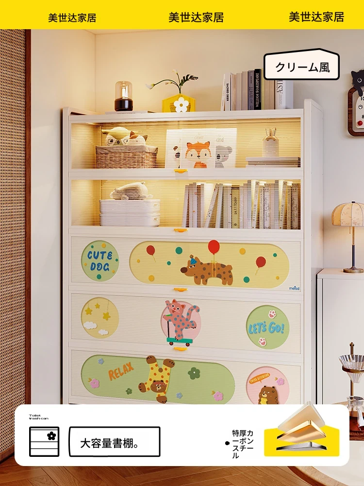 美世达クリーム風子供用フロア書棚 - アイアン製のクリエイティブ収納キャビネット!リビングや寝室に最適、埃を防ぎながら可愛くお部屋を彩ります。お子様の読書環境を楽しく整えましょう!