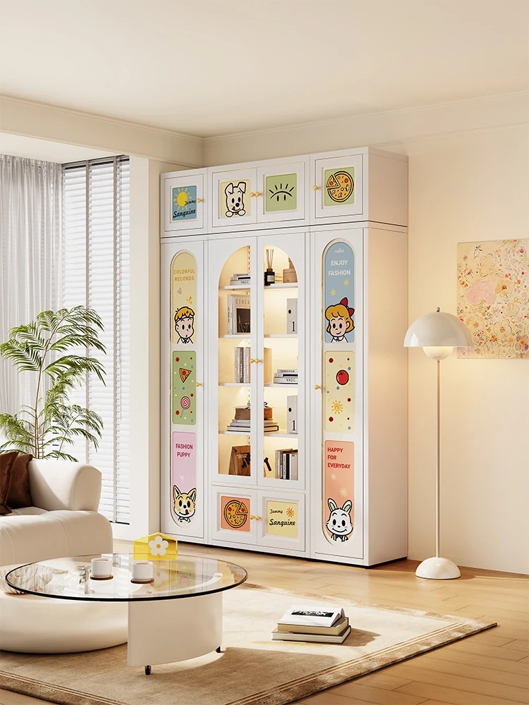 美世达木目調のヴィンテージ風ガラス扉書棚 - カーボンスチール製、床置き&壁付け対応、リビングルームにぴったりの収納力抜群なドーパミンブックシェルフ!おしゃれなデザインで空間を彩ります。